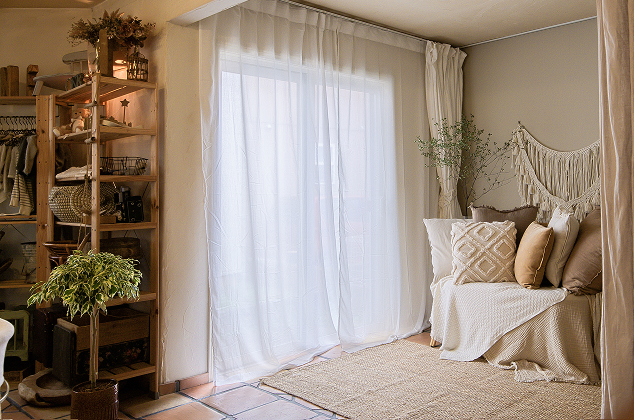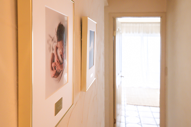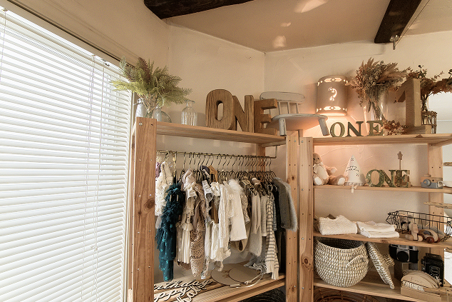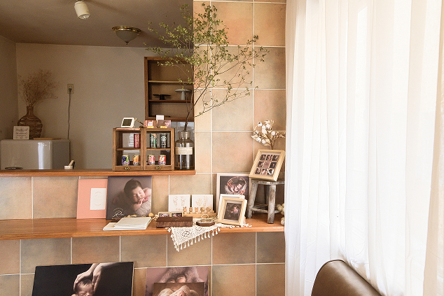 プライベートサロンのような非日常を五感で感じていただけるエントランスを抜けて、ママが座るソファから目に入るスタジオはまるでカフェにいるようなリラックスできる温かみのある空間へと変化します。